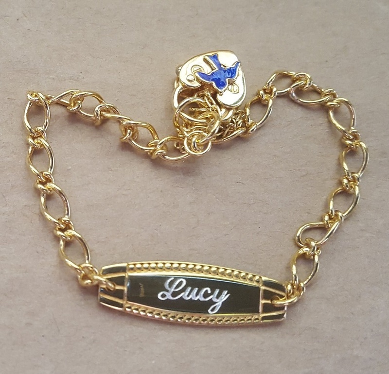 "What a glorious find, My Giddy Aunt, you are the answer to my prayers, I wanted something exquisite and special with character, and I found it with you, this child's/ baby bracelet is exactly what I wanted, it is so well presented and reasonably priced, that I will be back for more of the same, I am so impressed with my purchase of this 9 ct gold plated bracelet. After buying the gold plated bluebird child/baby bracelet, I had it engraved, and was it so beautifully done with a real touch of class, just perfect."